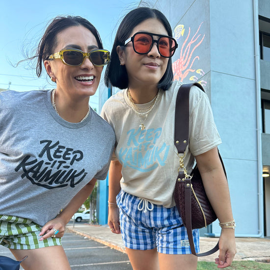 - Short sleeve beige tee with denim blue KIK logo on front and back.